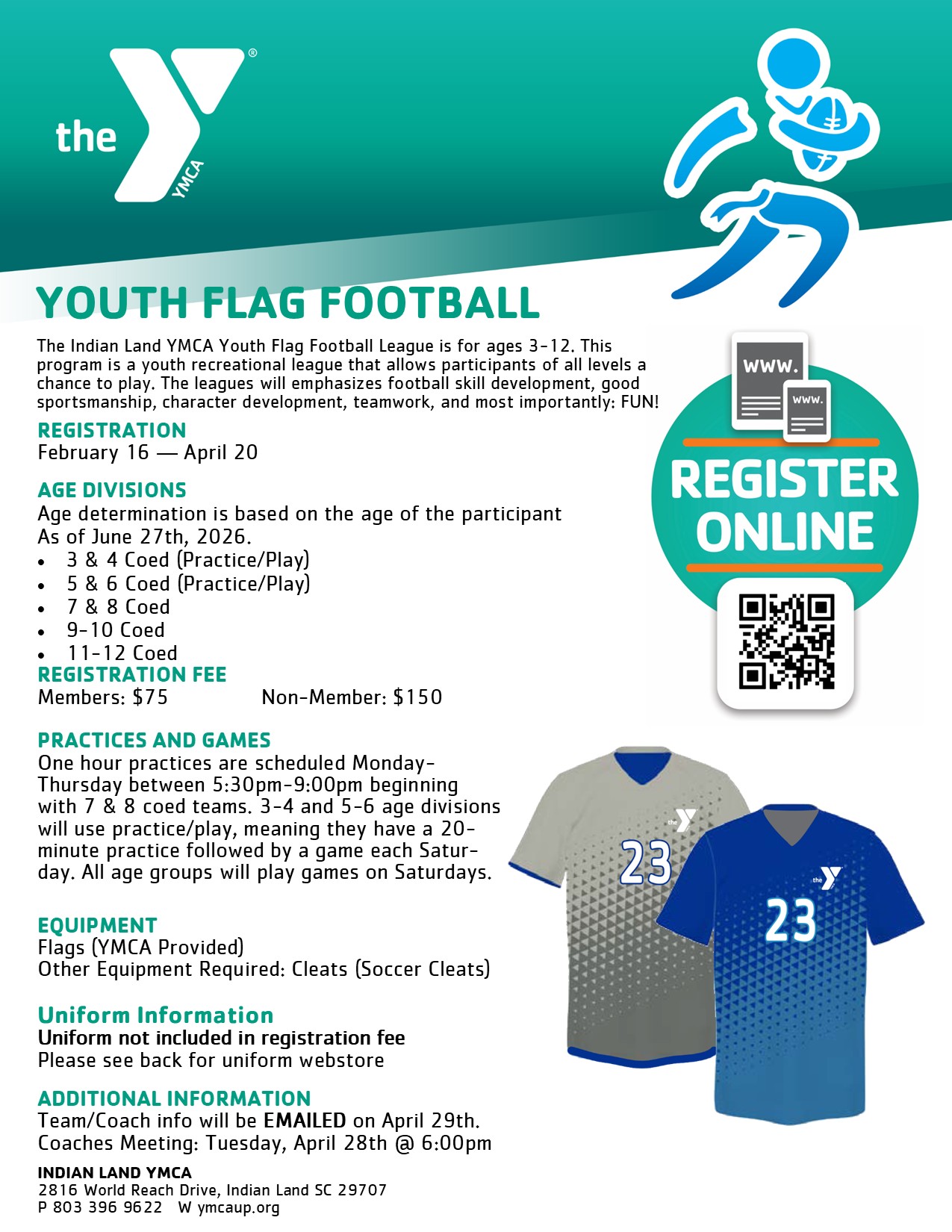 The Spring Flag Football season has arrived! Come join us for some fun on our fields this season! Children ages 3-12 will learn good sportsmanship, teamwork, and the skills of football! Registrations are currently open to everyone until April 20th. Interested in signing up? Use the link below!
